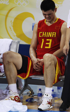 中國隊(duì)隊(duì)員姚明在比賽后的表情(8月20日攝)。