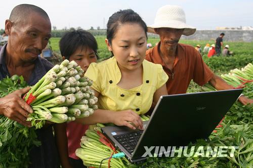 8月20日,山東博興縣博昌街道辦西谷王村村委會的劉敏(中)通過網(wǎng)絡(luò)視頻幫助農(nóng)民銷售西芹。日前,博興縣博昌街道辦發(fā)展種植的1萬多畝無公害西芹已陸續(xù)上市。當(dāng)?shù)卮逦瘯䦷椭r(nóng)民通過網(wǎng)絡(luò)視頻在田間地頭直接與外地客戶接觸,洽談蔬菜購銷,吸引了來自全國各地的客商。
