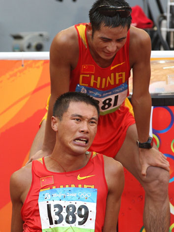 8月22日,中國選手司天峰(下)與李建波在比賽后。當日,司天峰在北京奧運會男子50公里競走比賽中獲得第17名,李建波獲得第14名。