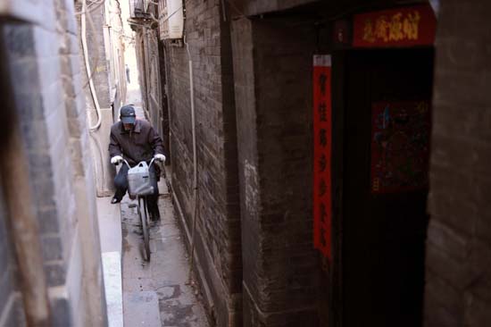 一名騎車人在狹窄的錢市胡同中穿行。本報(bào)記者:張領(lǐng)