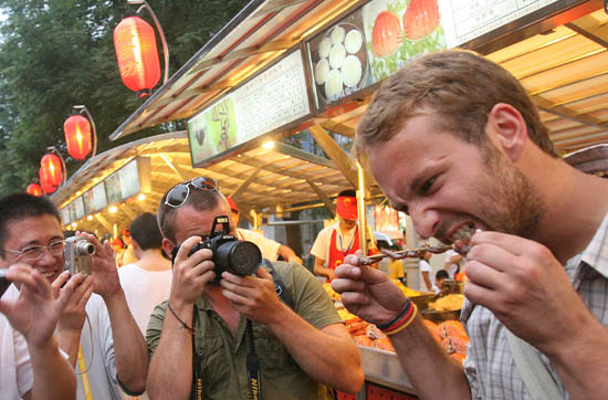 外國(guó)游客在北京東華門夜市品嘗中國(guó)傳統(tǒng)小吃。新華社發(fā)(陳曉根 攝)