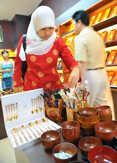 外國(guó)游客在大柵欄筷子商店里選購(gòu)筷子。本報(bào)記者:何俊昌