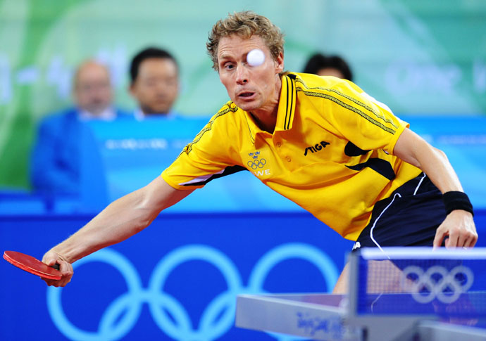 8月22日,佩爾森在比賽中。當(dāng)日,乒壇老將、瑞典選手佩爾森在北京奧運(yùn)會乒乓球男子單打四分之一決賽中以4比1戰(zhàn)勝克羅地亞選手普里莫拉茨,晉級半決賽。
