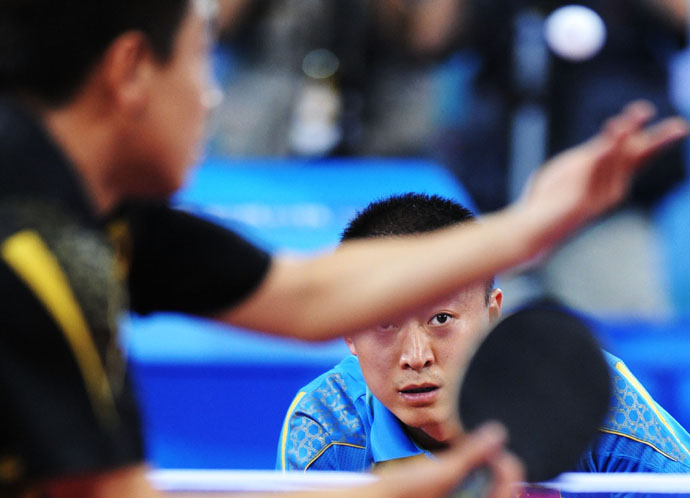 8月23日,中國選手馬琳準(zhǔn)備接對方的發(fā)球。當(dāng)日,馬琳在北京奧運(yùn)會(huì)乒乓球男子單打決賽中以4比1戰(zhàn)勝隊(duì)友王皓,獲得金牌。