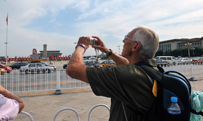 8月23日,一位游客在拍攝天安門廣場(chǎng)。隨著北京奧運(yùn)會(huì)即將結(jié)束,大批外國(guó)人來到天安門廣場(chǎng)參觀游覽。