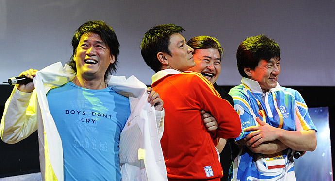 8月22日,在北京奧林匹克中心區(qū)中國移動展示廳,成龍、劉歡、劉德華和周華健(右起)在《難說再見》發(fā)布會上與奧組委工作人員互動。在奧運即將落幕之際,由四人首次攜手合作共同演唱的歌曲《難說再見》將作為北京奧運與世界話別的標志性符號。該曲由中國移動在發(fā)布會上同步無線首發(fā),并聯(lián)合北京奧組委文化活動部制作單曲,免費贈送給奧運工作者。