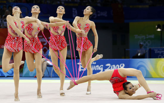 中國(guó)藝術(shù)體操新的歷史24日在北京工業(yè)大學(xué)體育館書(shū)寫(xiě)。中國(guó)姑娘們?cè)趭W運(yùn)會(huì)藝術(shù)體操比賽中,以35.225分歷史性地奪得集體全能銀牌,這也是中國(guó)藝術(shù)體操的首枚奧運(yùn)會(huì)獎(jiǎng)牌。 實(shí)力超群的俄羅斯隊(duì)以35.550分奪得金牌,再次包攬奧運(yùn)會(huì)藝術(shù)體操兩金。白俄羅斯隊(duì)以34.900分奪得銅牌。 北京奧運(yùn)會(huì)藝術(shù)體操項(xiàng)目設(shè)個(gè)人全能和集體全能兩枚金牌。此前,中國(guó)藝術(shù)體操的歷史最好成績(jī)是亞特蘭大奧運(yùn)會(huì)的第五名。24日的決賽中,中國(guó)藝術(shù)體操姑娘們?cè)诩议T(mén)口大放異彩。她們動(dòng)作編排精美,整體配合默契,在首輪5繩比賽中,就奪得第三名,超過(guò)主要競(jìng)爭(zhēng)對(duì)手意大利隊(duì)0.575分。 次輪3圈+2棒的比賽中,伴著京劇傳統(tǒng)音樂(lè)開(kāi)場(chǎng),中國(guó)姑娘們時(shí)而如飛鳥(niǎo)凌空展翅,時(shí)而如孔雀驚艷開(kāi)屏,甜美的笑容打動(dòng)了全場(chǎng)觀眾?胺Q完美的表現(xiàn)令中國(guó)隊(duì)得分超過(guò)白俄羅斯隊(duì),一舉奪得集體全能銀牌?粗罱K的得分大屏幕,中國(guó)藝體姑娘們高興地?fù)肀г谝黄穑蕹梢粓F(tuán)。她們創(chuàng)造了中國(guó)藝術(shù)體操新的歷史。 俄羅斯隊(duì)在決賽中再次展示了在藝術(shù)體操領(lǐng)域的“霸主”地位。兩輪的全場(chǎng)最高分讓她們?cè)俅伟鼣埩吮本⿰W運(yùn)會(huì)藝術(shù)體操的兩枚金牌。這也是從悉尼奧運(yùn)會(huì)開(kāi)始,俄羅斯隊(duì)連續(xù)三屆奧運(yùn)會(huì)實(shí)現(xiàn)個(gè)人全能和集體全能金牌的包攬。 賽后,中國(guó)隊(duì)的主力隊(duì)員章碩高興地說(shuō):“完全沒(méi)想到能拿到銀牌。我們創(chuàng)造了中國(guó)藝術(shù)體操最輝煌的一刻。為了這一刻,我們奮斗了這么久,吃了很多苦。今天,我們做到了最好。今天,所有付出都得到了回報(bào)! 對(duì)于奪得亞軍,中國(guó)隊(duì)教練白梅說(shuō):“其實(shí),中國(guó)隊(duì)的姑娘們訓(xùn)練特別艱苦,每天的訓(xùn)練都是在超越自己。今天的成績(jī)也是她們團(tuán)結(jié)一致、一起拼搏的結(jié)果!