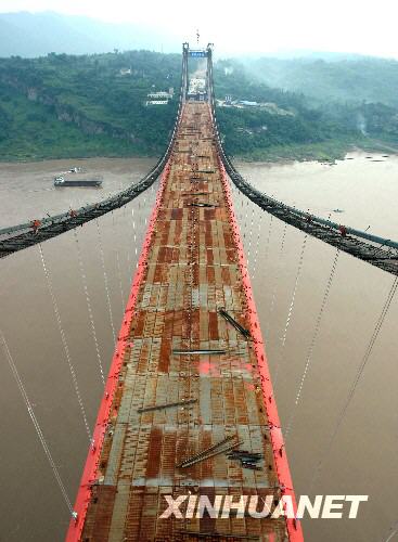 8月24日,隨著編號(hào)為“YZ24”的鋼箱梁吊裝到指定位置,重慶魚(yú)嘴長(zhǎng)江大橋主橋成功合龍。據(jù)介紹,重慶魚(yú)嘴長(zhǎng)江大橋全長(zhǎng)1438米,寬33米,大橋雙向6車道,主跨616米,設(shè)計(jì)時(shí)速100公里,預(yù)計(jì)2009年內(nèi)通車。