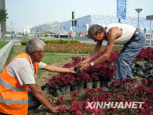 8月27日,北京奧運(yùn)會(huì)閉幕三天后,園藝工人在北京水立方附近為迎接殘奧會(huì)精心擺花。北京2008年殘奧會(huì)將在9月6日開幕。