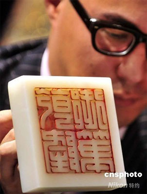 八月二十六日,香港蘇富比舉行“中國瓷器及工藝品秋季拍賣會” 媒體預(yù)展,展示的乾隆帝御寶交龍鈕《乾隆御筆》白玉璽。其玉璽之白玉質(zhì)地極為通靈溫潤,通體潔白致密,而且體量碩大,印面達(dá)到是十二點(diǎn)五平方厘米,是所有乾隆帝名號璽中最大的一方,實(shí)屬罕見。預(yù)料成交價超過五千萬港元。