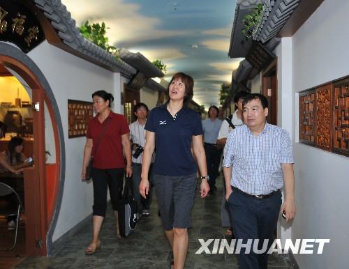 8月28日,美國女排主教練郎平(中)在古玩城內(nèi)游覽。