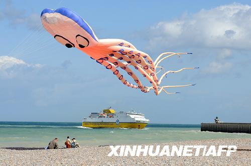 9月6日,在法國北部迪耶普舉行的第15屆國際風箏節(jié)上,一個章魚形風箏升空。今年的風箏節(jié)吸引了來自38個不同國家和地區(qū)的愛好者參加。新華社/法新