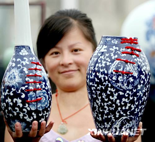 9月7日在安徽省淮北市景德鎮(zhèn)瓷器展上拍攝的別致瓷器。在淮北市舉辦的景德鎮(zhèn)瓷器展上,造型圖案十分別致的“青花鈕扣”等瓷器吸引了觀眾的目光。