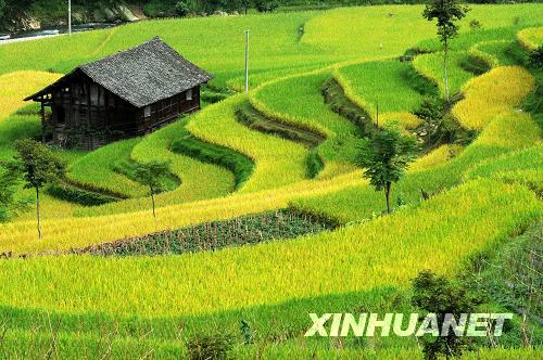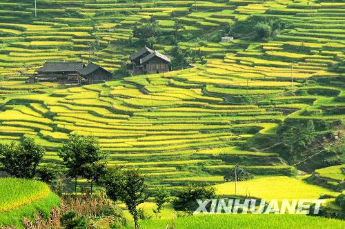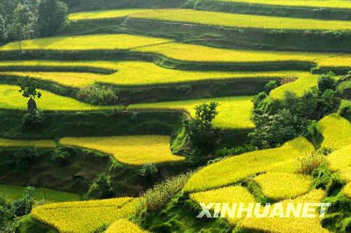 9月7日拍攝的都勻市基場水族鄉(xiāng)稻谷豐收的景象。貴州省都勻市基場水族鄉(xiāng)今年風調(diào)雨順,稻谷長勢喜人,隨著金秋時節(jié)的到來,梯田里的稻谷已開始成熟,呈現(xiàn)出一派豐收的美麗景象。