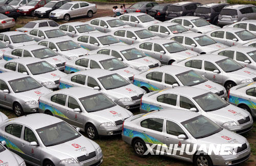 9月7日在北京亞運村汽車交易市場拍攝的正在為拍賣進行預(yù)展的奧運會專用車。近日,百輛奧運會專用車在北京亞運村汽車交易市場預(yù)展,即將公開拍賣,吸引了許多消費者前來咨詢。