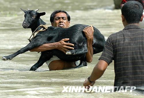 9月7日,孟加拉國(guó)博格拉地區(qū)的一名男子抱著山羊在洪水中行進(jìn)。孟加拉國(guó)一官員當(dāng)日稱,由于洪災(zāi)情況嚴(yán)重,使得該國(guó)至少60萬(wàn)人受困,大約1.4萬(wàn)人進(jìn)入救援中心避難。新華社/法新 |