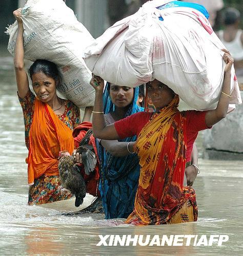 9月7日,孟加拉國(guó)博格拉地區(qū)的婦女在洪水中行進(jìn)。孟加拉國(guó)一官員當(dāng)日稱,由于洪災(zāi)情況嚴(yán)重,使得該國(guó)至少60萬(wàn)人受困,大約1.4萬(wàn)人進(jìn)入救援中心避難。新華社/法新 | |
