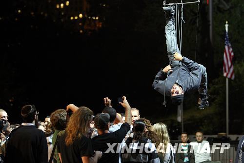 9月22日,美國魔術(shù)師戴維·布萊恩(右上)在紐約中央公園開始進(jìn)行60小時(shí)的倒掛特技表演,挑戰(zhàn)人類極限。新華社/法新