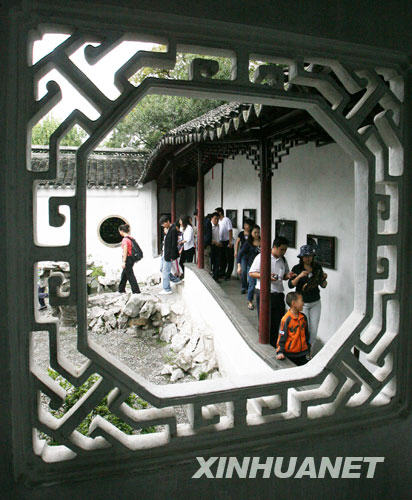 10月4日,在蘇州古典園林獅子林,游客從造型別致的花窗旁經(jīng)過。