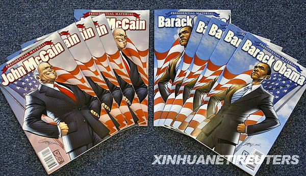 這張2008年10月6日在美國圣迭戈一家出版商辦公室內(nèi)拍攝的照片展示即將出版的美國民主黨總統(tǒng)候選人奧巴馬(右)和共和黨總統(tǒng)候選人麥凱恩(左)的漫畫傳記。奧巴馬和麥凱恩的漫畫傳記將于10月8日出版,出版商希望它們能受到成年人的青睞。新華社/路透