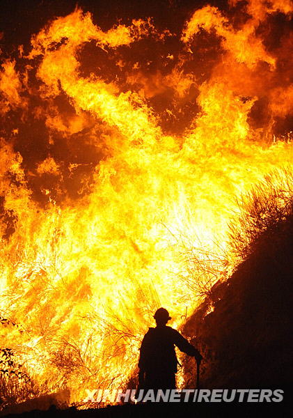 10月12日,在美國洛杉磯市區(qū)以北約20公里的峽谷地區(qū),消防員在準備滅火。時速達每小時50英里的陣風導致這場森林火災不斷蔓延,威脅到附近的農(nóng)場和房屋。新華社/路透