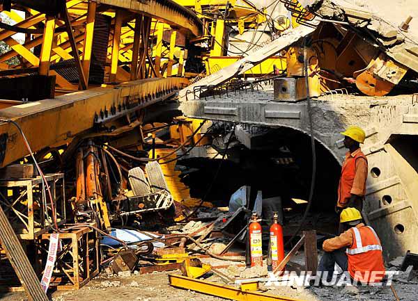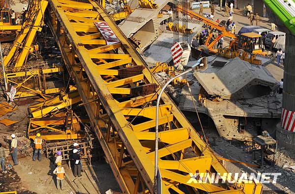 10月19日,在印度首都新德里市郊,施工人員對一處在建輕軌高架橋工地的事故現(xiàn)場進行清理。