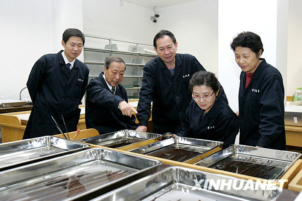 10月22日,著名歷史學家、清華大學出土文獻研究與保護中心主任李學勤(左二)與同事們在研究竹簡。