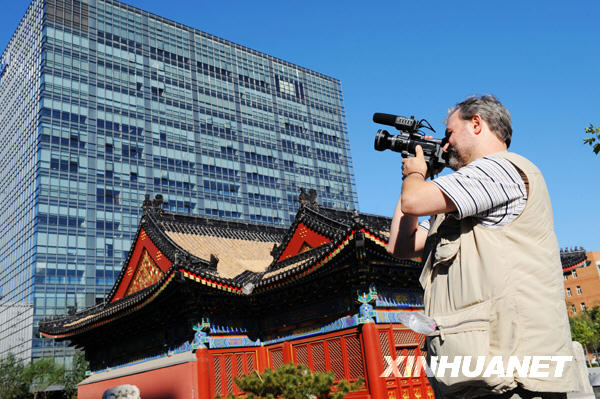 10月23日,來自俄羅斯全國電視廣播公司的記者鮑里斯在北京金融街街頭拍攝。