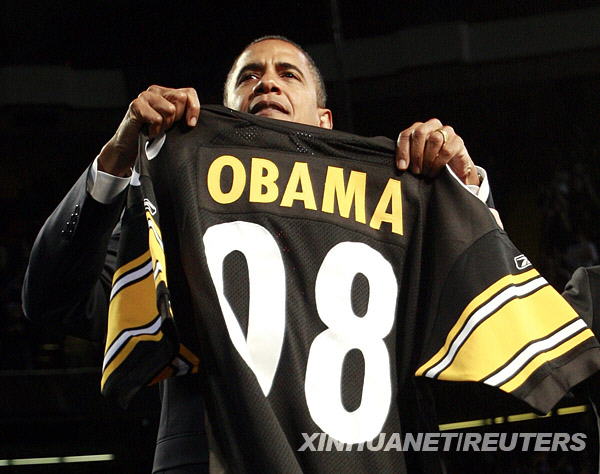 10月27日,在美國賓夕法尼亞州的匹茲堡,美國民主黨總統(tǒng)候選人奧巴馬在競選集會活動中接受當(dāng)?shù)亻蠙烨蜿?duì)主席贈送的“08”號球衣。新華社/路透