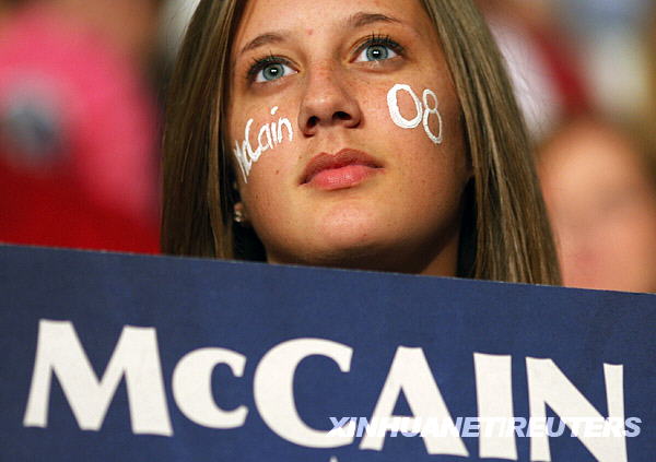 10月27日,在美國俄亥俄州的代頓,一名臉上寫著“麥凱恩08”字樣的女子參加共和黨總統(tǒng)候選人麥凱恩的競選集會。新華社/路透