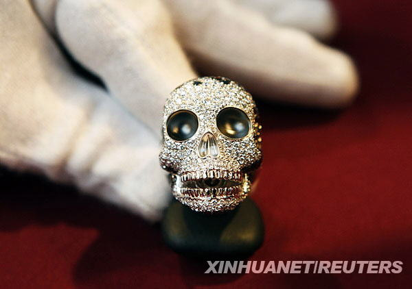 10月30日,在比利時(shí)布魯塞爾的超級(jí)奢侈品展開幕前 ,工作人員展示一枚打造成骷髏狀的鉆石戒指。這枚戒指價(jià)值8560歐元。奢侈品展上亮相的除了珠寶,還有汽車、藝術(shù)和時(shí)尚類展品。新華社/路透