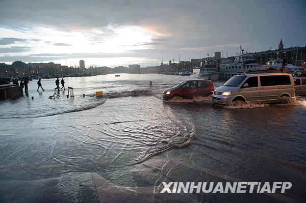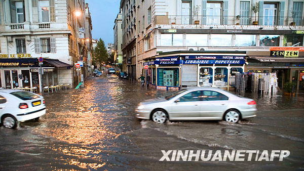 11月2日,在法國南部馬賽港,人們駕駛汽車從洪水侵襲的街頭駛過。據(jù)法國營救機(jī)構(gòu)稱,法部分地區(qū)由于受暴雨侵襲致使大批人員撤離家園。新華社/法新