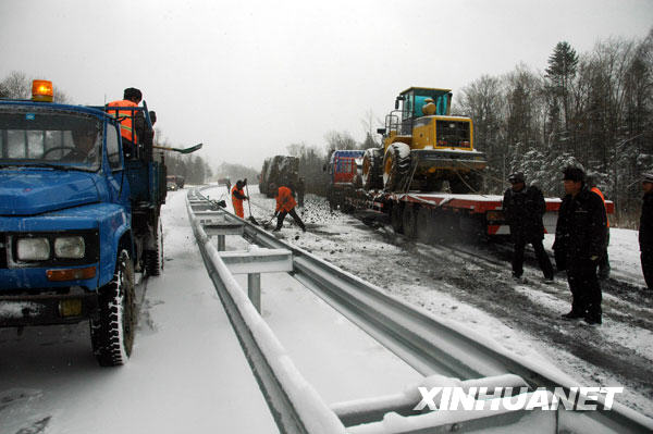 11月3日,在哈爾濱至牡丹江高速公路虎峰嶺段,路政部門工作人員清雪除冰。