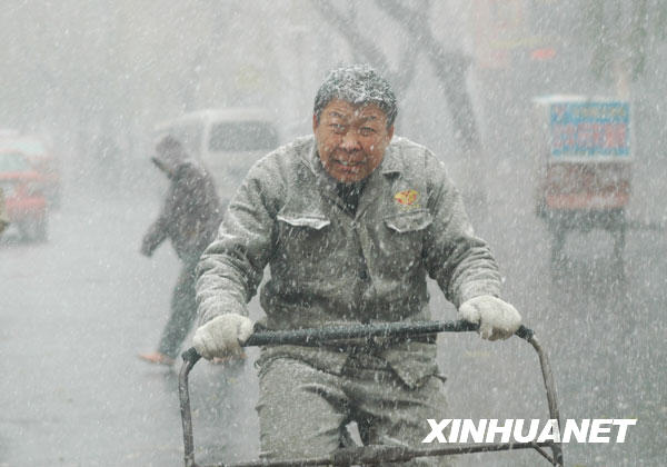 11月3日,路人在風雪中艱難前行。