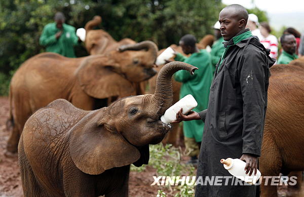 1月10日,在肯尼亞首都內(nèi)羅畢的大象孤兒院,一名飼養(yǎng)員喂養(yǎng)幼年大象。大象“孤兒院”自成立至今已成功救助了130多頭幼象。目前孤兒院每天對外開放1小時,其間由工作人員向觀眾介紹幼象的生長狀況、有關(guān)非洲象的基本知識等,并呼吁人們抵制偷獵行為、關(guān)愛野生動物。新華社/路透