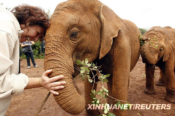 11月10日,在肯尼亞首都內(nèi)羅畢的大象孤兒院,游客和幼年大象玩耍。