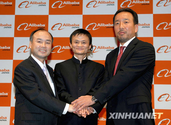 11月11日,在日本首都東京,阿里巴巴集團(tuán)董事局主席馬云(中)和日本軟銀集團(tuán)董事長(zhǎng)孫正義(左)以及阿里巴巴日本株式會(huì)社董事長(zhǎng)香山誠(chéng)(右)合影。 |