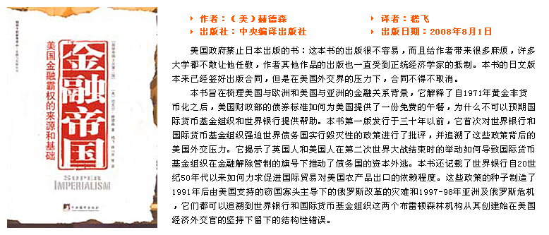 邁克爾·赫德森的這本輝煌的具有毀滅性沖擊力的著作將引起正統(tǒng)經(jīng)濟(jì)學(xué)家深深的不安和憤怒的反擊。古典經(jīng)濟(jì)學(xué)家不喜歡人們提起帝國主義的丑陋現(xiàn)實。赫德森是當(dāng)前世界上少數(shù)幾位用令人吃驚的角度看待老問題的經(jīng)濟(jì)思想家。