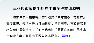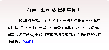 | 引發(fā)三亞出租車罷運的導(dǎo)火索,諸如“份錢過高”、“黑車橫行”等,幾乎與重慶出租車罷運事件毫無二致。如果存在于國內(nèi)出租車業(yè)“份錢過高”的通病,都需要以出租車司機罷運的方式來解決,更將對社會矛盾的求解起到一個非常不好的示范效應(yīng)。[詳情] | |