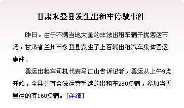 | 7月29日起,一次出租車司機集體停運的事件在這個城市發(fā)生,為期約4天。7月30日一天,就有7列火車的旅客大量滯留在銀川火車站。[詳情] | |