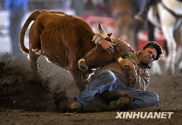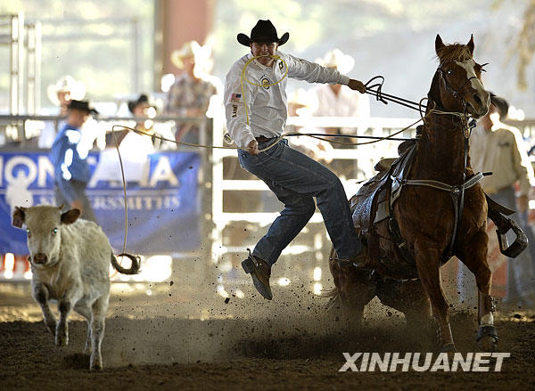 11月16日,來(lái)自內(nèi)華達(dá)州拉斯維加斯的選手賈森在套牛比賽中。當(dāng)日,2008加利福尼亞專業(yè)牛仔競(jìng)技大會(huì)在加州諾科市舉行,來(lái)自加州、內(nèi)華達(dá)和亞利桑那州的專業(yè)牛仔競(jìng)技選手參加為期三天的比賽。牛仔競(jìng)技源自牛仔在放牧過(guò)程中的各種騎術(shù)、馴馬和擒牛等技巧,如今演變成有規(guī)則觀賞性強(qiáng)的競(jìng)技比賽,深受北美人的喜愛,每年僅美國(guó)專業(yè)牛仔競(jìng)技協(xié)會(huì)舉辦的比賽就接近百場(chǎng)。