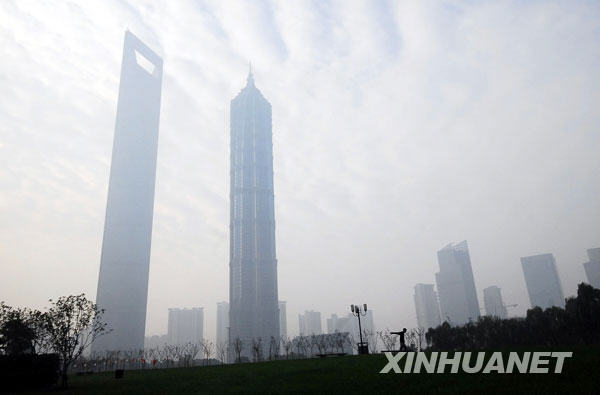 11月26日拍攝的大霧籠罩的上海金茂大廈和環(huán)球金融中心。當(dāng)日清晨,上海出現(xiàn)大霧,崇明島上霧氣最濃,最低能見度僅為50米。當(dāng)?shù)貧庀笈_(tái)發(fā)出大霧黃色預(yù)警信號(hào)。新華社發(fā)