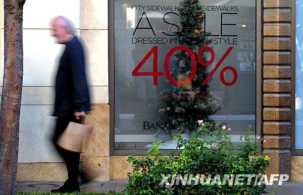 11月30日,一名男子從美國洛杉磯一家購物中心的櫥窗旁經(jīng)過。根據(jù)28日一項(xiàng)民調(diào)顯示,33%的受訪者表示將縮減今年的圣誕預(yù)算。新華社/法新