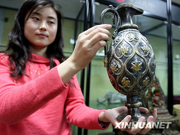 12月2日,工作人員在展示拍品“北周西番蓮紋龍柄銀鎏金胡瓶”。中拍國際2008秋季珍品拍賣會將于12月20日在北京亞洲大酒店舉槌,薈萃了金銀器精華拍品的22件古代金銀器系列拍品將作為此次拍賣會的一大亮點,為廣大收藏愛好者提供一場別樣的盛宴。