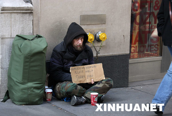 12月5日,美國勞工部公布的數(shù)據(jù)顯示,今年11月份美國非農(nóng)業(yè)部門就業(yè)崗位減少53.3萬個,為1974年12月份以來的最大減幅,失業(yè)率上升到6.7%,為15年來的最高點。這是11月11日,一名流浪漢在美國紐約曼哈頓街頭乞討。 |