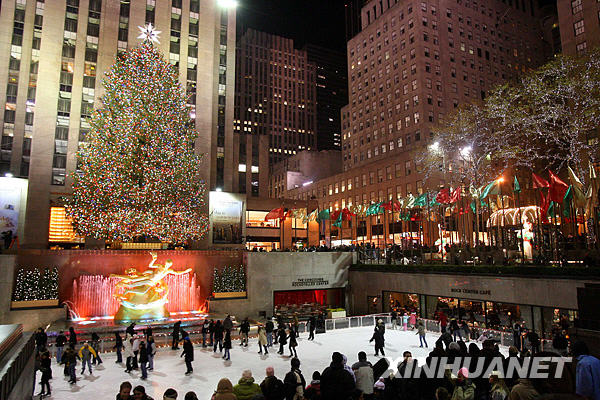 12月7日,一些游客在美國紐約洛克菲勒中心前巨大的圣誕樹下溜冰。洛克菲勒中心的圣誕樹號稱全美最有名的圣誕樹。今年選中的圣誕樹是一棵77年樹齡的挪威云杉,高約22米,裝飾有彩燈和一顆巨大的水晶星。隨著圣誕節(jié)的臨近,紐約各處的景點、商場和社區(qū)紛紛裝扮成一年中最靚麗的模樣,吸引廣大市民和游客前來參觀。