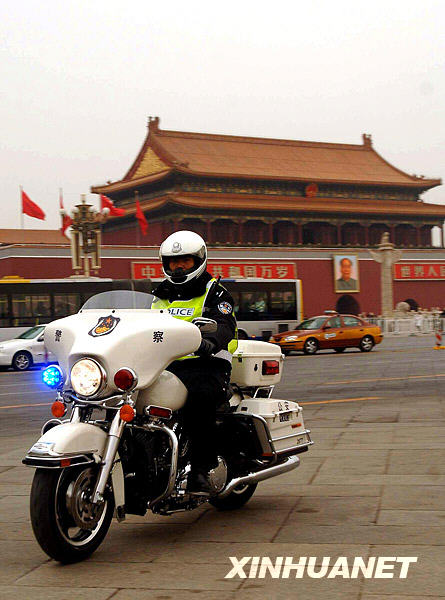 12月10日,一名交警駕駛警用哈雷摩托車在天安門廣場巡邏。