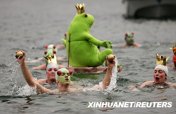 12月14日,在瑞士日內(nèi)瓦湖,身穿獨特服裝的選手參加第71屆“圣誕杯”冬泳比賽。新華社/路透