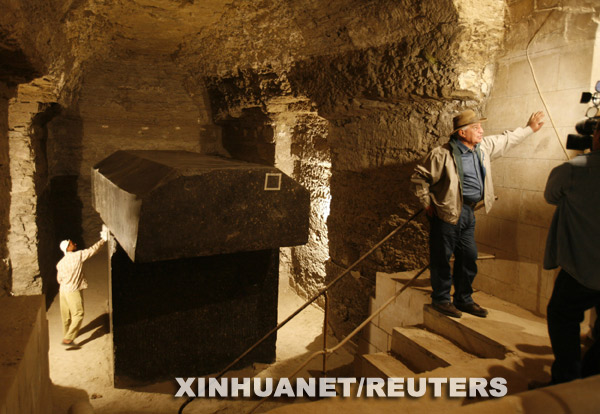 12月22日,在埃及首都開羅南部的塞加拉地區(qū),埃及最高文物委員會(huì)主席扎!す咚乖谝蛔掳l(fā)現(xiàn)古墓的考古現(xiàn)場(chǎng)向媒體介紹情況。埃及考古學(xué)家近日在塞加拉地區(qū)發(fā)現(xiàn)了兩座4300年前的古墓,歷史可以追溯到埃及古王國(guó)時(shí)期第五和第六王朝,考古學(xué)家表示該地區(qū)還有更大的墓地群未被發(fā)掘。 新華社/路透