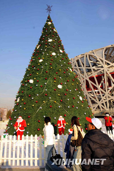 12月23日,游客在國(guó)家體育場(chǎng)(“鳥(niǎo)巢”)前參觀大圣誕樹(shù)。當(dāng)日,一棵高24米,底盤(pán)直徑為12米的圣誕樹(shù)在國(guó)家體育場(chǎng)(“鳥(niǎo)巢”)前布置完成。除了這棵大型圣誕樹(shù)外,奧林匹克公園內(nèi)還搭建了110棵5米高的圣誕樹(shù)。這些圣誕樹(shù)與圣誕木屋以及各種彩燈和裝飾掛件把奧林匹克公園裝扮得格外美麗。